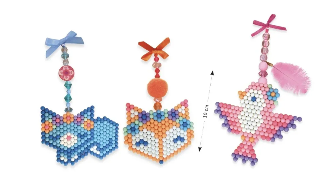 Een kit om 3 hangers in de vorm van een dier te maken met waterparels. De kinderen plaatsen het model onder de doorzichtige honingraatplaat. De kinderen brengen de gekleurde parels aan om het voorgestelde model na te bootsen en spuiten vervolgens water op hun creatie. Eenmaal droog, plakken de parels als magie aan elkaar! Daarna voegen ze kralen, lint en bedeltjes toe om hun creaties om te toveren tot prachtige hangers.