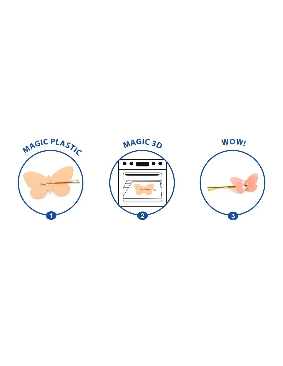 Met deze kit kunnen de kinderen haarjuwelen maken van gekleurd krimpplastic! Daartoe snijden ze de vooraf getekende vormen uit de verstrekte bladen, of gebruiken ze de kleine, kant-en-klare onderdelen en zetten die in elkaar. Eenmaal in de oven krimpen de figuren en wordt het plastic dik en stijf. De accessoires kunnen worden gebruikt voor de mooiste kapsels!