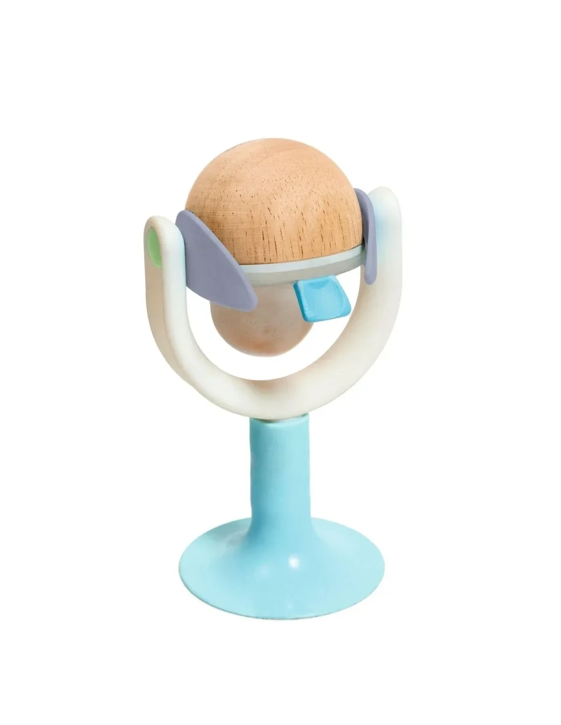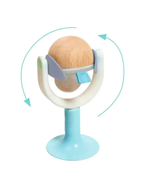 Een rammelaar-tuimelaar in de vorm van een vogel, gemaakt van natuurlijk hout en in pastelkleuren, voor baby's vanaf 3 maanden. Doordat de tuimelaar op zichzelf draait, laat de vogel het rinkelende geluid van knikkers horen. Bovendien ziet het kind de knikkers bewegen. Wanneer het speeltje wordt omvergeworpen, keert het steeds terug naar de rechtopstaande positie. Het kind kan zich amuseren door de vogel te laten draaien, zonder deze te laten vallen, dankzij de zuignap die zich gemakkelijk vasthecht aan gladde oppervlakken.