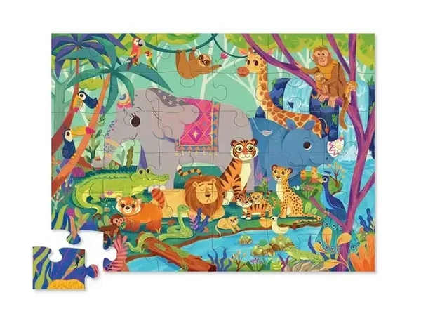 Met deze kleurrijke puzzel van Crocodile Creek kunnen kinderen zich urenlang vermaken in de jungle! De puzzel bestaat uit 36 stevige kartonnen stukjes die perfect in elkaar passen. De afbeelding toont een levendige jungle scène met allerlei dieren, planten en bomen. Kinderen zullen genieten van het leggen van de stukjes en het ontdekken van alle details in de afbeelding.