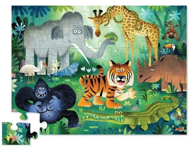 Met deze kleurrijke puzzel van Crocodile Creek kunnen kinderen zich urenlang vermaken in de jungle! De puzzel bestaat uit 36 stevige kartonnen stukjes die perfect in elkaar passen. De afbeelding toont een levendige jungle scène met allerlei dieren, planten en bomen. Kinderen zullen genieten van het leggen van de stukjes en het ontdekken van alle details in de afbeelding.