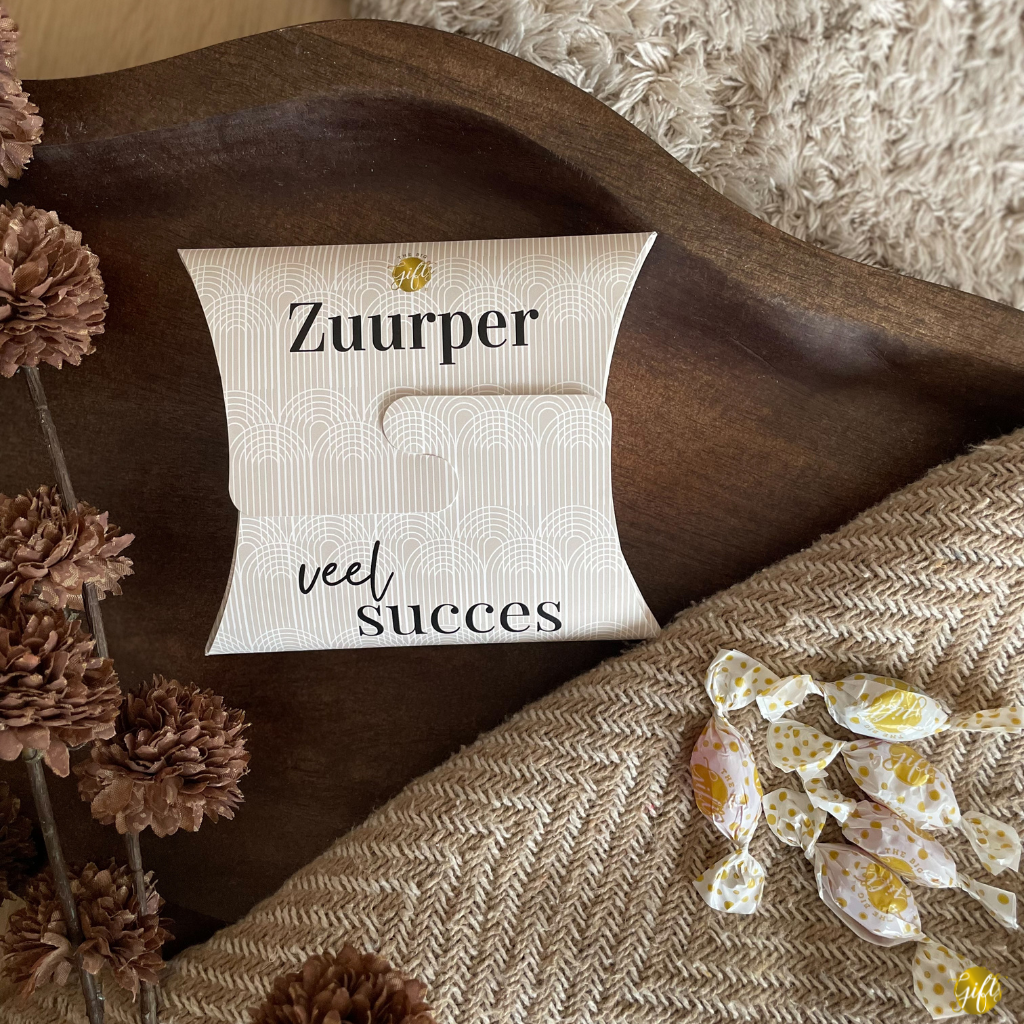 Perfect als bedankje voor collega’s, klanten, juffen, meesters, buren of gewoon iemand die het verdient. De vrolijke verpakking met de tekst Zuurper Veel Succes maakt het extra leuk om te geven.