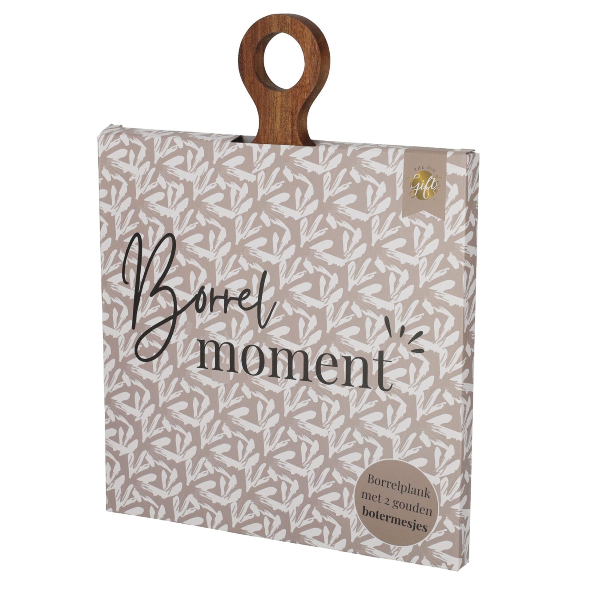 Inhoud: 1 borrelplank en 2 gouden botermesjes