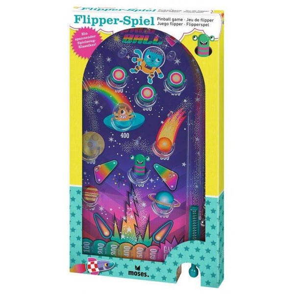 Super gaaf draagbaar flipper spel met een metalen achterzijde en 6 speelballen waarmee je in het spel diverse punten kunt scoren door ze in het juiste vakje te schieten. Top cadeau.Merk: MosesAfmetingen: 13,6 x 25,3 x 1,5 cm