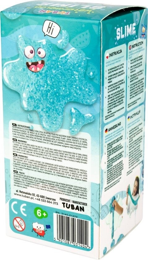 Inhoud: 100 ml turquoise pva-lijm met een watermeloengeur, 100 ml activator, 1 g turquoise minerale glitter, een spatel voor het mengen van de ingrediënten, een bewaardoos en een maatbeker